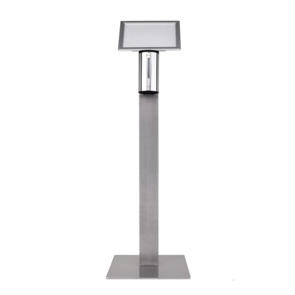 RVS desinfectiepaal met automatischeNo-Touch dispenser en een A4 kliklijst voor gebruiksinstructies.